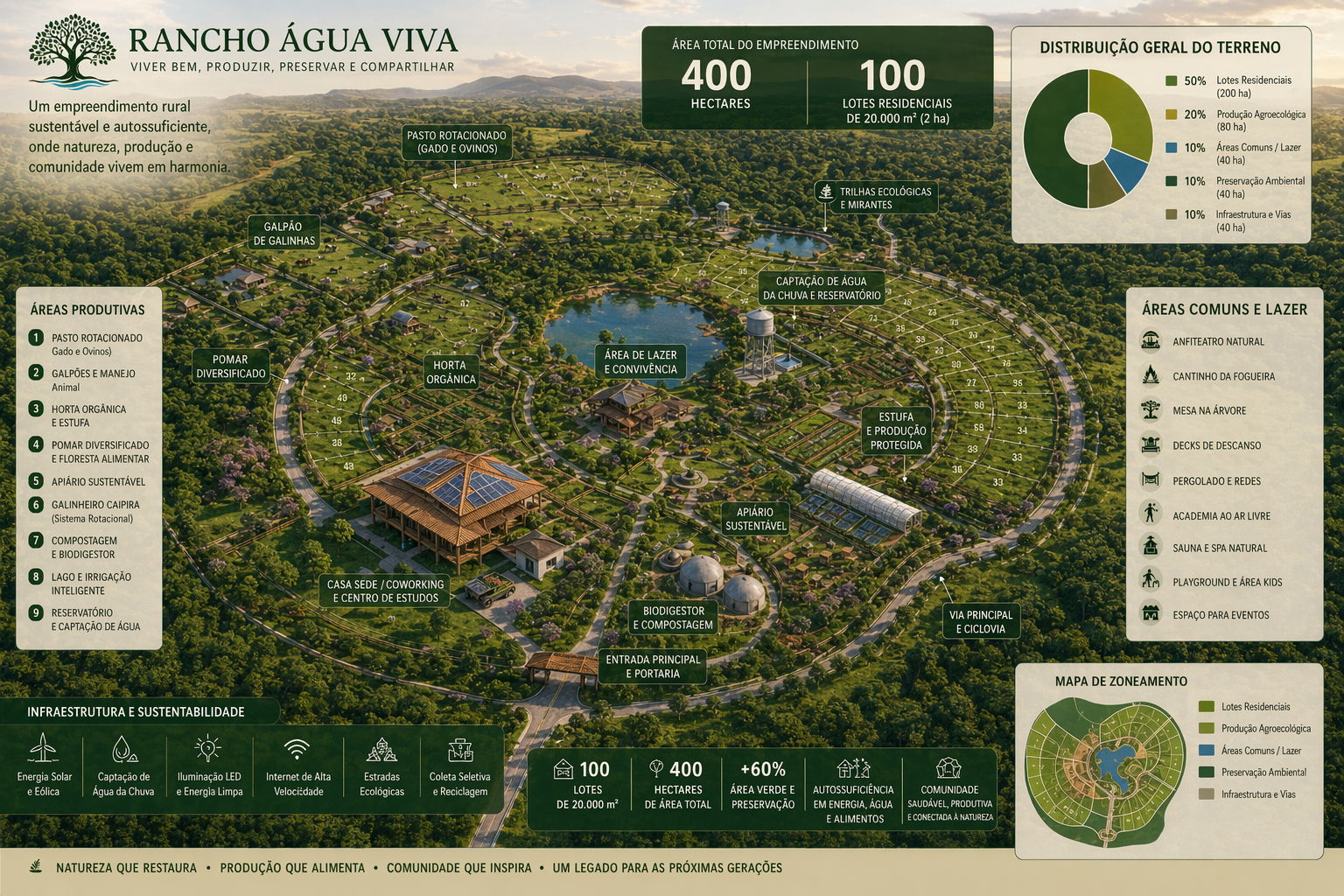 Comunidade rural de alto padrão com produção agroecológica, áreas comuns de lazer e preservação ambiental — pensada para quem busca legado, natureza e método.